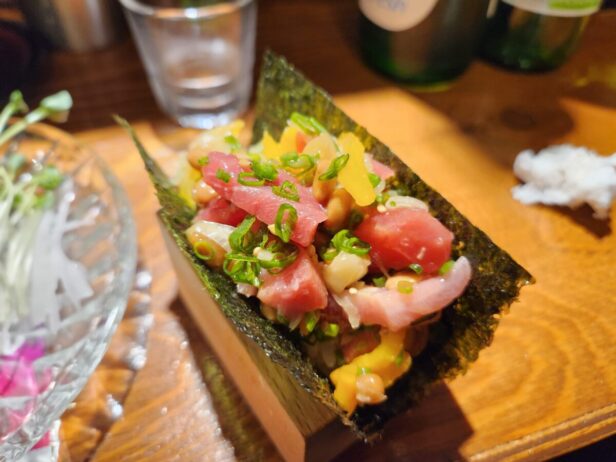 이어진 마구로낫또마끼는 이번 방문의 하이라이트였습니다. 참치와 낫또가 아낌없이 올라간 비주얼은 압도적이었으며, 이를 맛본 동행인은 주저 없이 ‘오늘 먹은 음식 중 1등’이라고 외쳤습니다. 낫또의 끈득한 식감과 참치의 고소함이 어우러진 그 맛은 다음 방문 시 반드시 재주문해야 할 목록에 올랐습니다.