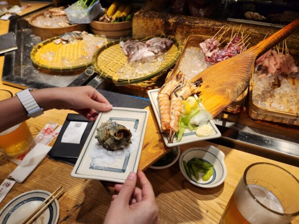 매장에 들어서자마자 가장 먼저 시선을 사로잡는 것은 조리대 앞에 정갈하게 늘어선 신선한 식재료들이었습니다. 얼음이 가득 담긴 바구니 위로 꼬치류와 각종 해산물들이 가지런히 놓여 있어, 눈으로 먼저 맛을 보는 듯한 기분이 들었습니다. 은은한 조명 아래 비치는 재료들의 윤기는 이곳이 얼마나 신선한 식재료를 사용하는지를 증명하는 듯했습니다. 손님들과 조리 공간이 맞닿아 있는 카운터석 구조 덕분에, 일본 현지 로바다야끼 특유의 생동감 넘치는 분위기를 온몸으로 만끽할 수 있었습니다.