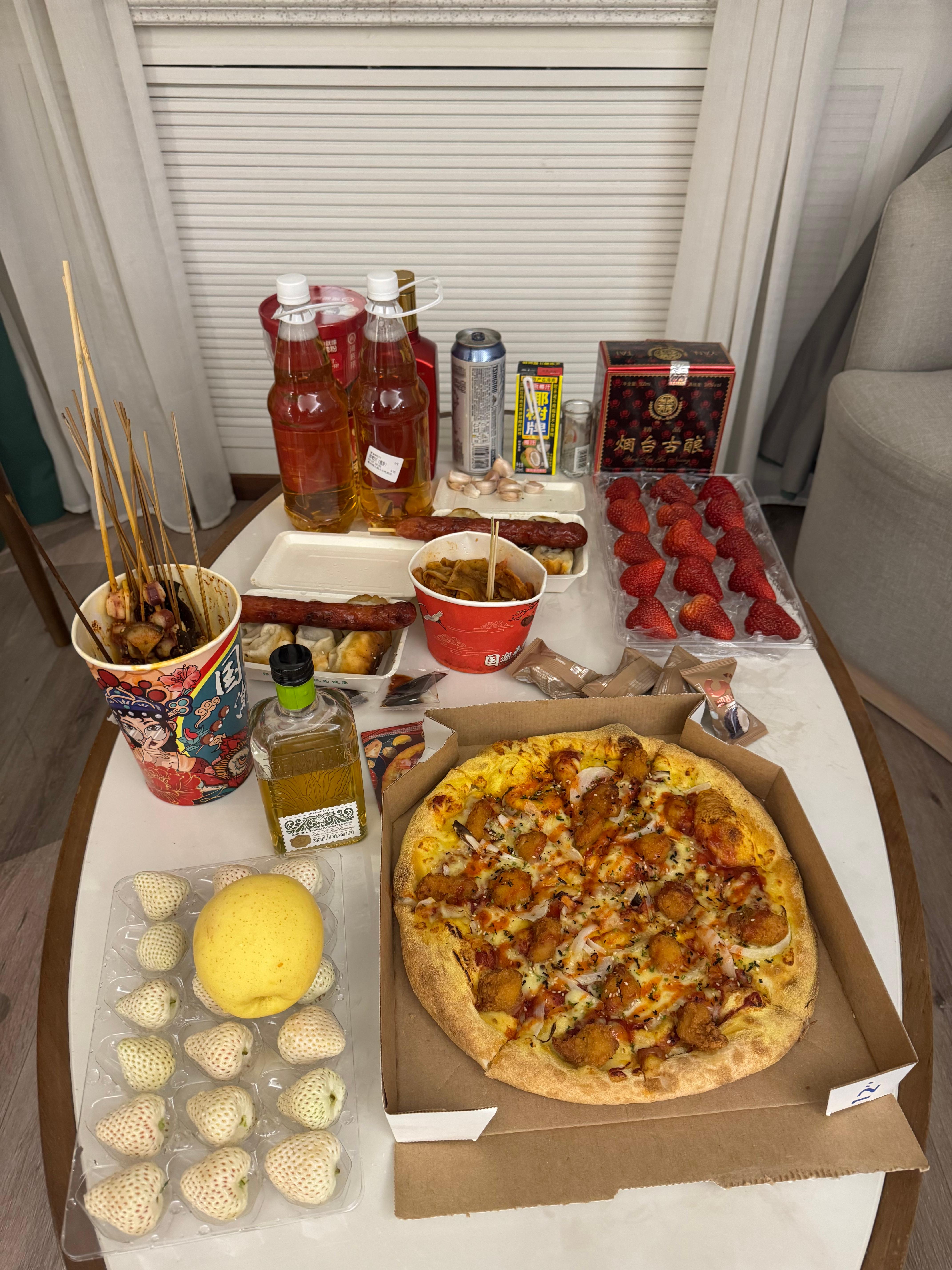 숙소로 돌아와 포장해온 음식들과 피자를 펼쳐놓고 2차 파티를 열었습니다. 함께 곁들인 과일은 생각보다 밍밍했지만, 술기운과 분위기에 취해 밤이 어떻게 지나갔는지 모를 정도로 즐거운 시간이었습니다. 오늘 하루 알차게 보냈다는 안도감과 함께 연태의 밤이 깊어갑니다.